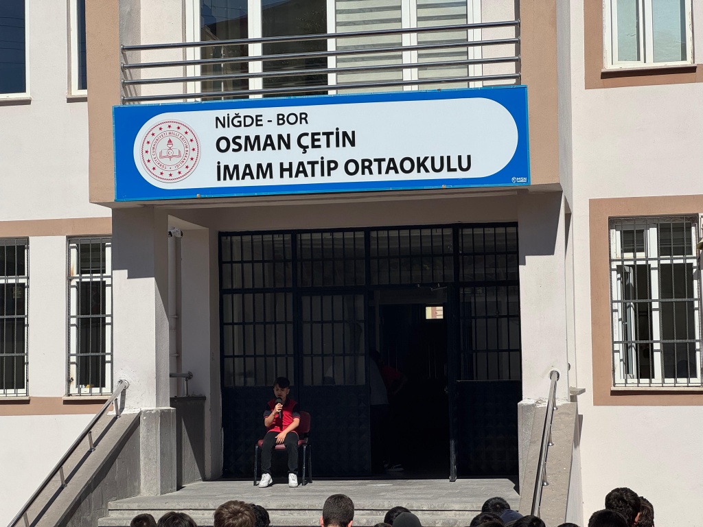 Millî Eğitim Bakanı Yusuf Tekin’in talimatıyla 81 ilde eş zamanlı olarak düzenlenen “Filistin ve Gazze” temalı farkındalık etkinliği kapsamında, Bor Osman Çetin İmam Hatip Ortaokulu öğrencileri de duyarlılıklarını ortaya koydu.